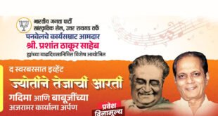 लोकप्रिय आमदार प्रशांत ठाकूर यांच्या वाढदिवसानिमित्त 4 ऑगस्टला कार्यक्रम पनवेल ः रामप्रहर वृत्तमहाराष्ट्राचे आधुनिक वाल्मिकी ग.दि. माडगूळकर आणि ज्येष्ठ संगीतकार सुधीर फडके उर्फ बाबूजी यांच्या अजरामर कार्याला मानवंदना असलेल्या ज्योतीने तेजाची आरती या संगीतमय कार्यक्रमाचे आयोजन कार्यसम्राट व लोकप्रिय आमदार प्रशांत ठाकूर यांच्या वाढदिवसानिमित्त 4 ऑगस्ट रोजी सायंकाळी 7.30 वाजता …