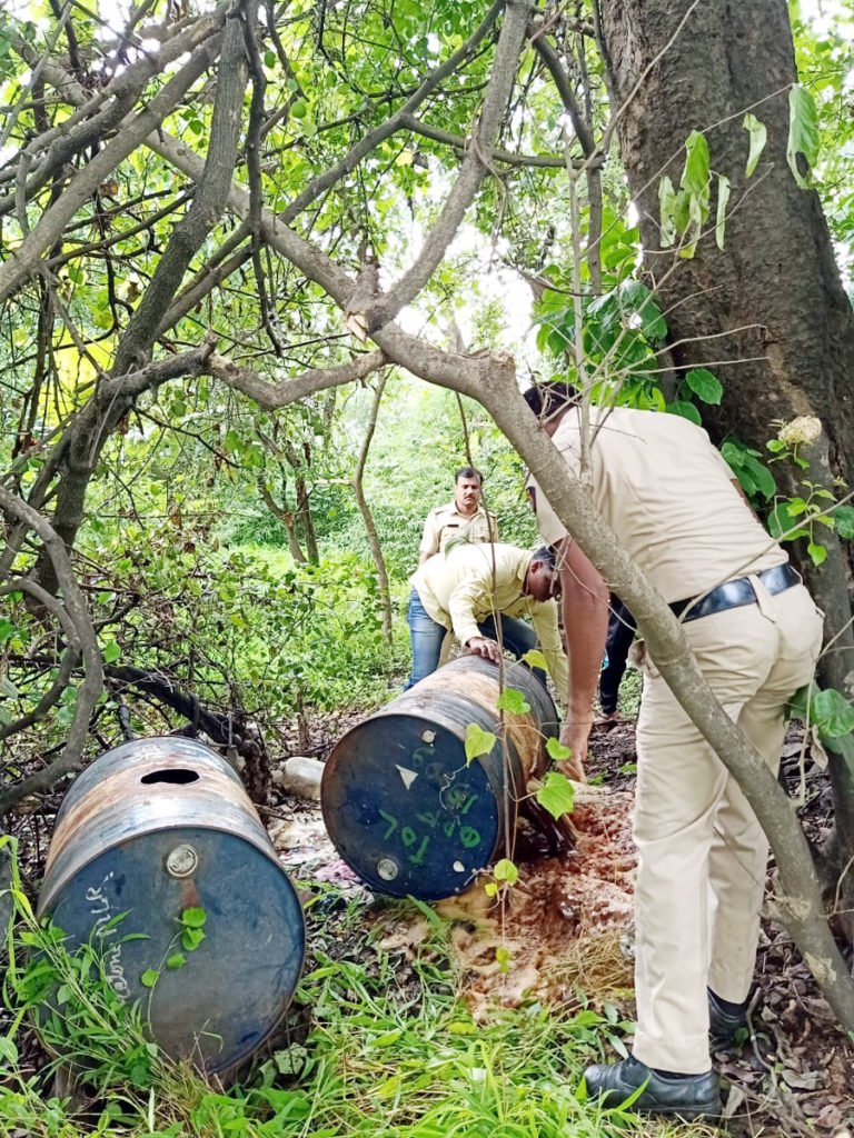 कर्जत तालुक्यातील बेकरे गावाच्या परिसरात गावठी दारू बनविली जात असल्याची खबर सहाय्यक पोलीस निरीक्षक अविनाश पाटील यांना मिळाली होती. त्यानंतर उपनिरीक्षक रतीलाल तडवी आणि राम शिद यांनी अन्य पोलिसांसह बेकरे येथे जाऊन गावठी दारूचे अड्डे उद्ध्वस्त केले. त्यात कोला धबधबा परिसरात ओहोळाच्या बाजूला सुरू असलेल्या गावठी दारूच्या हातभट्टीचा समावेश आहे. या वेळी पोलिसांची चाहूल लागताच गावठी दारू बनविणारे जंगलात पळून गेले. या वेळी पोलिसांनी नवसागर गूळमिश्रित रसायन भरलेले पाच प्लास्टिक पिंपांमधील रसायन जमिनीवर ओतून टाकले, तसेच रबरी ट्यूबमध्ये भरलेले रसायन आणि दारू गाळण्याचे साहित्यदेखील फोडून टाकले. या कारवाईत 36,100 रुपयांचे गावठी दारू बनविण्याचे साहित्य जमीनदोस्त करण्यात आले. त्याचवेळी गावाच्या खांबाया मंदिर परिसरात पोलिसांनी धाड टाकली. तेथे सहा प्लास्टिक पिंपांत रसायन भरले होते. ते जमिनीवर ओतून पोलिसांनी प्लास्टिक पिंपे फोडून टाकली. तेथील दारू गाळण्याच्या टाक्यादेखील फोडून टाकण्यात आल्या. या कारवाईत तब्बल 41,100 रुपयांचे साहित्य जमीनदोस्त करण्यात आले.