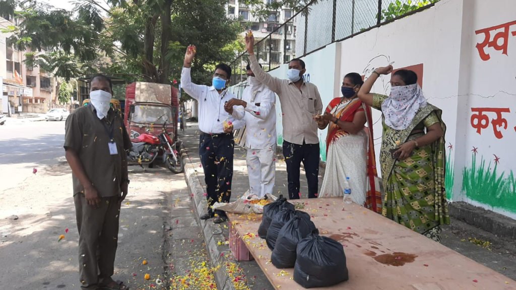 कोरोना या वैश्विक संकटात आपला स्वतःचा जीव धोक्यात घालून परिसर स्वच्छ ठेवणार्या पनवेल महापालिकेच्या स्वच्छता दुतांवर गुरुवारी खांदा वसाहतीत पुष्पवर्षाव करण्यात आला. इतकेच नाही. तर या कामगारांना आठ दिवस पुरेल इतके धान्य देऊन एक प्रकारे कृतज्ञता व्यक्त करण्यात आली. यासाठी ज्येष्ठ नगरसेविका सिता सदानंद पाटील आणि सामाजिक कार्यकर्ते सुनील खाडे यांच्यासह इतरांनी पुढाकार घेतला. लॉकडाऊन काळातही पनवेल महानगरपालिकेच्या स्वच्छता कर्मचार्यांनी आपले काम सुरू ठेवले आहे. मनपा क्षेत्रातील रस्ते, पदपथ स्वच्छ करणे, झाडू मारणे, झाडाचा पालापाचोळा जमा करणे, डोअर टू डोअर जाऊन कचरा संकलित करणे, परिसरात फवारणी करून निर्जंतुकीकरण करणे, पावडर मारणे यासारखी अनेक कामे संबंधित स्वच्छता दूत करीत आहेत. त्यामुळे पनवेल महानगरपालिका क्षेत्रात कमालीची स्वच्छता दिसून येते. अशाप्रकारे वैश्विक संकटात तसेच साथीच्या रोगाचा संसर्ग होत असताना स्वतःचा जीव धोक्यात घालून नागरिकांचे आरोग्य अबाधित राखणार्या या स्वच्छता दुतांचे काम खर्या अर्थाने कौतुकास्पद आहे. त्यांच्या या कामाबद्दल खांदा वसाहतीत नगरसेविका सिताताई सदानंद पाटील, सामाजिक कार्यकर्ते सुनील खाडे यांच्यासह इतरांनी कृतज्ञता व्यक्त करण्याचा निर्णय घेतला. वसाहतीतील पाण्याच्या टाकीचा येथे गुरुवारी स्वच्छता कर्मचार्यांना आदरपूर्वक निमंत्रित करण्यात आले. सामाजिक अंतराने या सर्वांवर पुष्पवृष्टी करण्यात आली. त्याचबरोबर त्यांना जीवनावश्यक कोरडा शिधा वाटप करण्यात आला. त्यासाठी पाटील व खाडे यांच्यासह शशिकांत खाडे, ज्ञानेश्वर देशमुख व शशिकांत योगे यांनी योगदान दिले. या वेळी उपसचिव रविंद्र गुरव, कळंबोली वाहतूक शाखेचे वरिष्ठ पोलीस निरीक्षक अंकुश खेडकर, सदानंद पाटील, भाजपच्या महिला कार्यकर्त्या अनिता रासकर चेतन जाधव, मिथुन दर्गे, तन्मय सावंत उपस्थित होते.