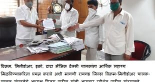 पेण ः प्रतिनिधी – शेअर पद्धतीने प्रवासी सेवा देणार्या विक्रम, मिनीडोअर, इको, टाटा मॅजिक टॅक्सीचालकांना अर्थसहाय्य मिळविण्याकरिता प्रयत्न करावेत, अशी मागणी रायगड जिल्हा विक्रम-मिनीडोअर चालक-मालक संघटनेचे अध्यक्ष विजय पाटील यांनी आमदार रविशेठ पाटील यांच्याकडे निवेदनाद्वारे केली आहे. कोरोनामुळे 22 मार्चपासून शासनाने खासगी प्रवासी वाहतूक बंद केली असून त्यामुळे विक्रम चालक-मालकांना …
