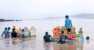मुरूड : प्रतिनिधी पाण्यात विरघळत नसल्याने भरतीबरोबर मुरूड समुद्र किनारी वाहून आलेल्या प्लास्टर ऑफ पॅरिसच्या 243 गणेशमूर्तीचे श्रीसदस्यांनी शुक्रवारी पुन्हा एकदा खोल समुद्रात विसर्जन केले. मुरूड तालुक्यात गुरुवारी 10 दिवसांच्या गणपतींचे विसर्जन करण्यात आले होते, मात्र दुसर्याच दिवशी पहाटे समुद्र किनार्यावर शेकड्याने मूर्ती वाहून आल्या होत्या. धर्माधिकारी प्रतिष्ठनच्या मुरूड तालुक्यातील …